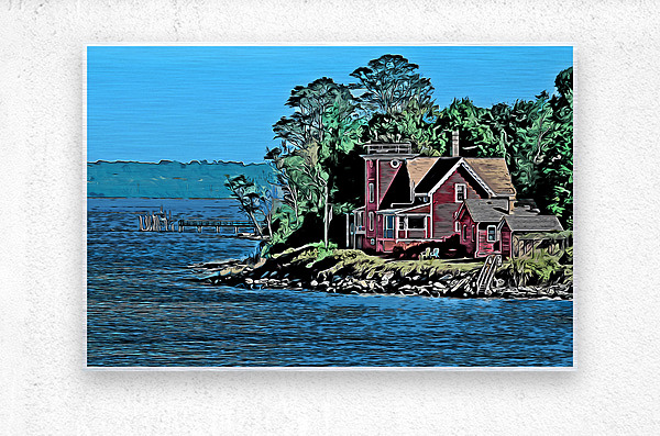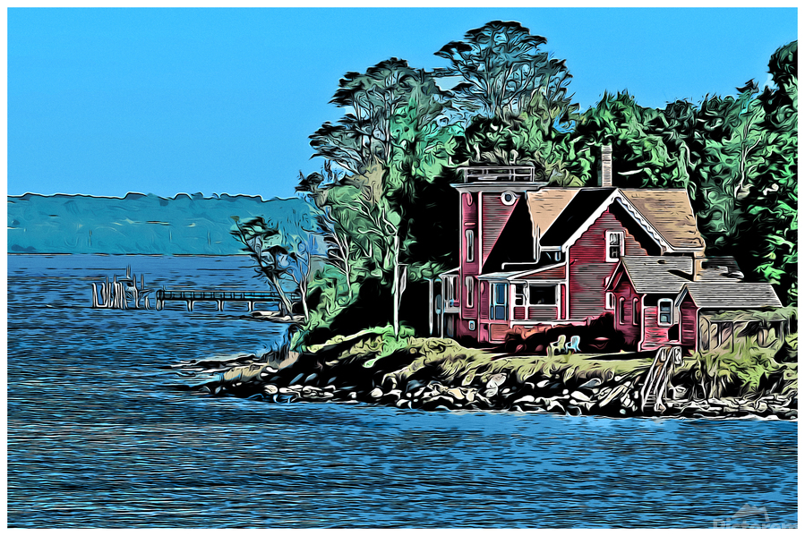 Digital illustrative painting of North Conanicut Island Lighthouse on a sunny day in Rhode Island.