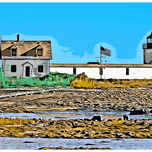 Digital illustrative painting of Cape Porpoise Lighthouse, also known as Goat Island Light, at low tide in Maine.