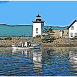 Digital illustrative painting of lobster boat by Grindle Point Lighthouse on Islesboro Island in midcoast Maine.