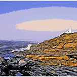 Digital illustrative painting of early dawn after sunrise over Pemaquid Point Lighthouse and its unique rock formations in midcoast Maine.