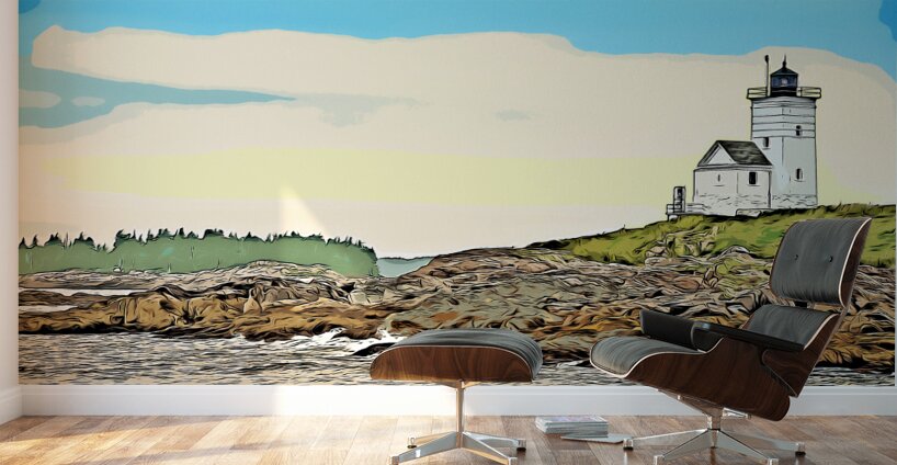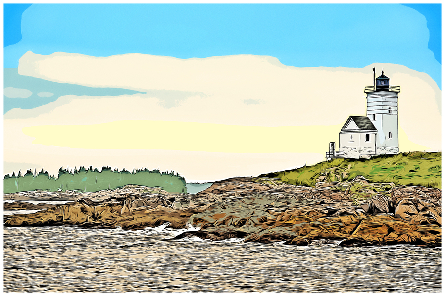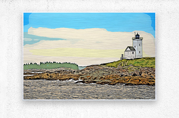 Digital illustrative painting of Two Bush Island Lighthouse tower among rocky islands in midcoast Maine.