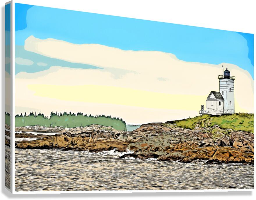 TWO BUSH ISLAND LIGHT TOWER AMONG ROCKY ISLANDS IN MIDCOAST MAINE - ILLUS. ALLAN WOOD  Canvas Print