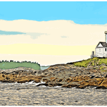 ABOUT THIS ARTWORK: TWO BUSH ISLAND LIGHT TOWER AMONG ROCKY ISLANDS IN MIDCOAST MAINE - ILLUS.