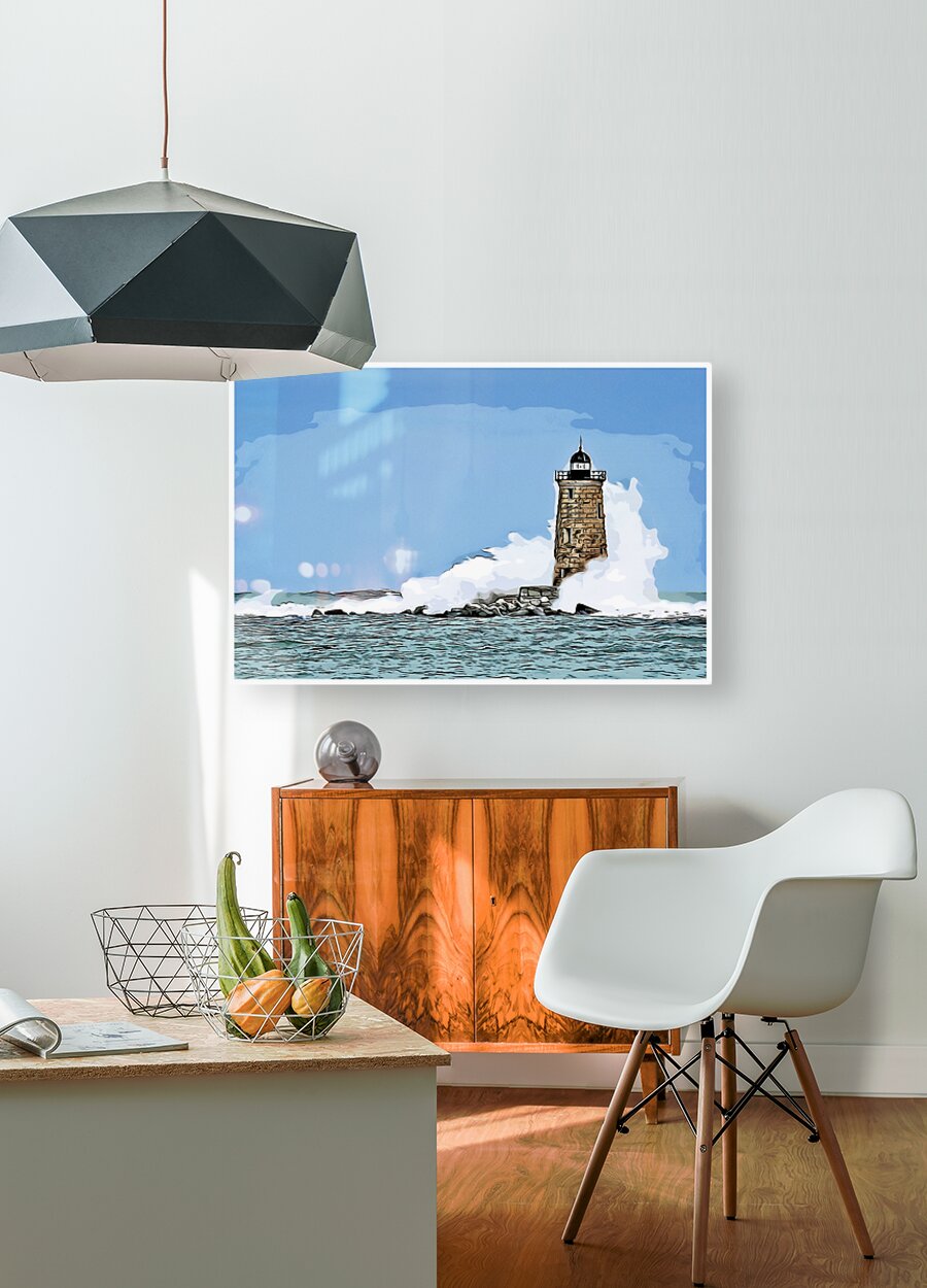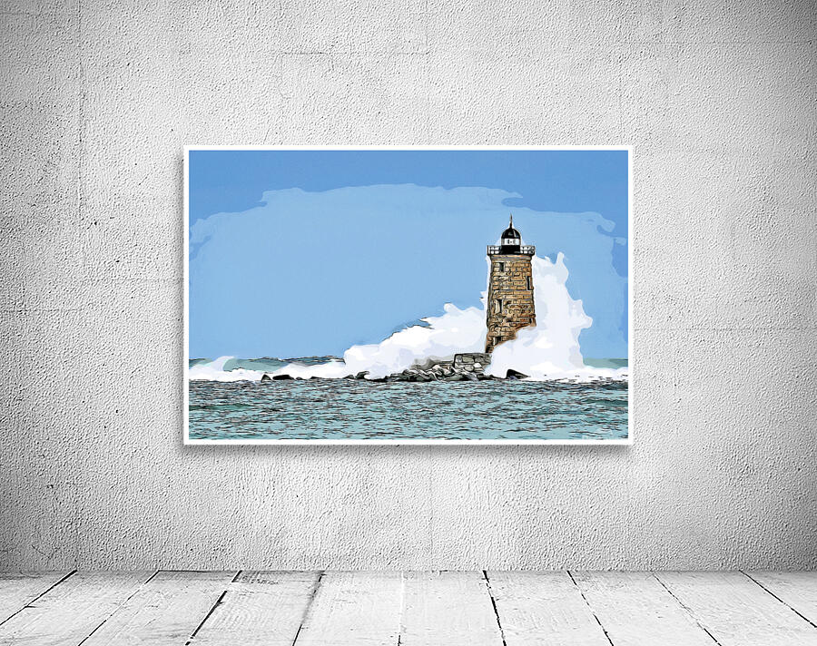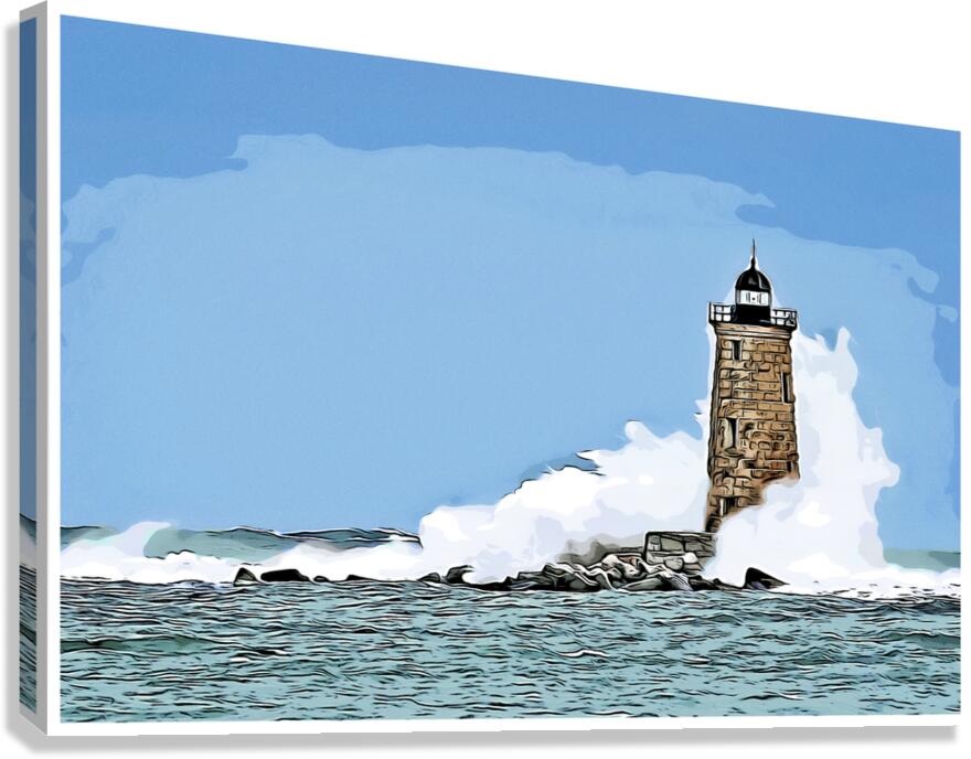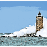 Get this artwork "Great Wave Covers Stone Tower of Whaleback Light in Maine - Illus." in a framed print.