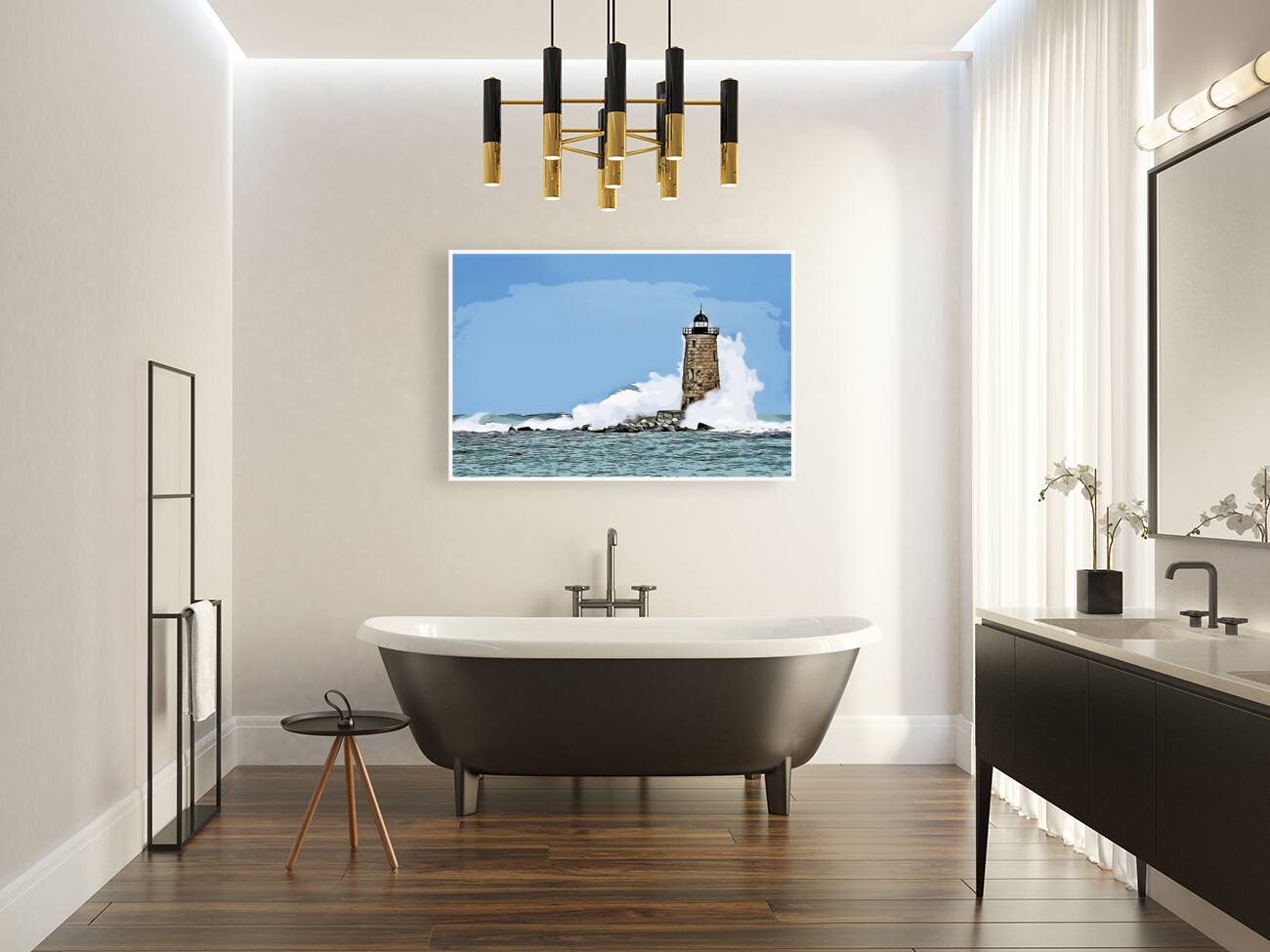 Digital illustrative painting of giant waves covering the stone tower of Whaleback lighthouse in southern Maine during an astronomically high tide.