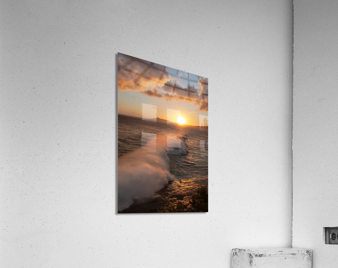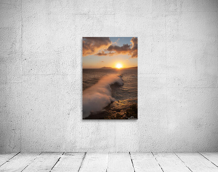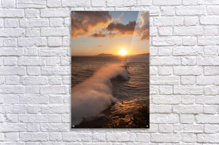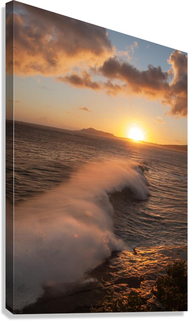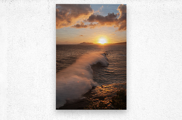 As the setting sun casts its golden glow, a south swell crashes along the lava ledge with Diamond Head in the distance. The raw power and beauty of the ocean are on full display, as the waves crash and dance along the rugged coastline.