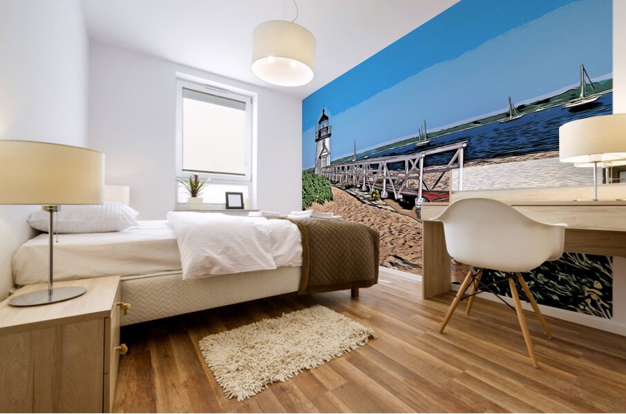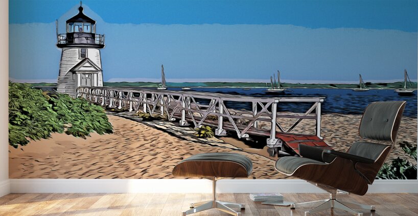 Digital illustrative painting of wooden walkway leading to Brant Point Lighthouse overlooking Nantucket Harbor on Nantucket Island off Cape Cod in Massachusetts.
