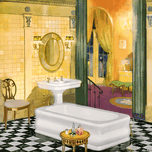 This vintage 1920s Americana art shows a beautiful bathroom and American home in the 1920s. Derivative art © 2024 Row One Brand