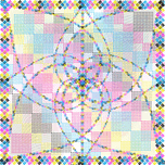 12/12/23 A variation of "See 'Em? Why Kay!" Transparent textured boxes in cyan, magenta, yellow and black (CMYK) are combined and layered, then repeated. Overlays of swirling "stitches" and tilted colored boxes complete the quilt in this digital art work.