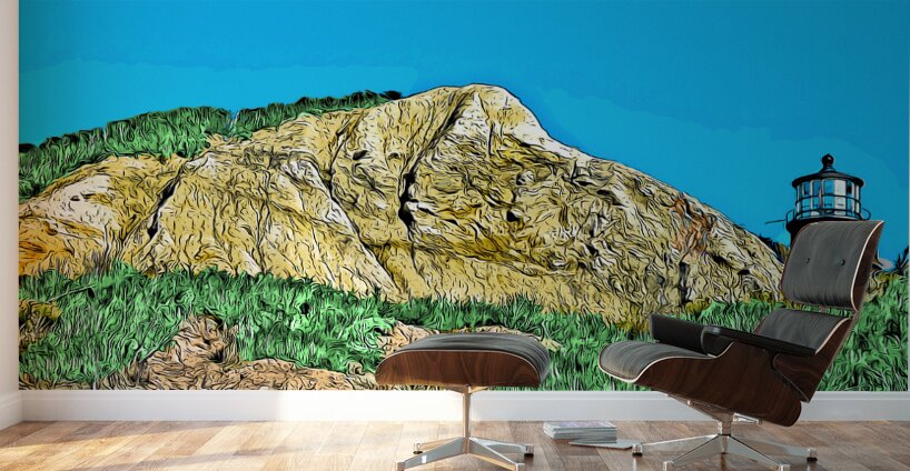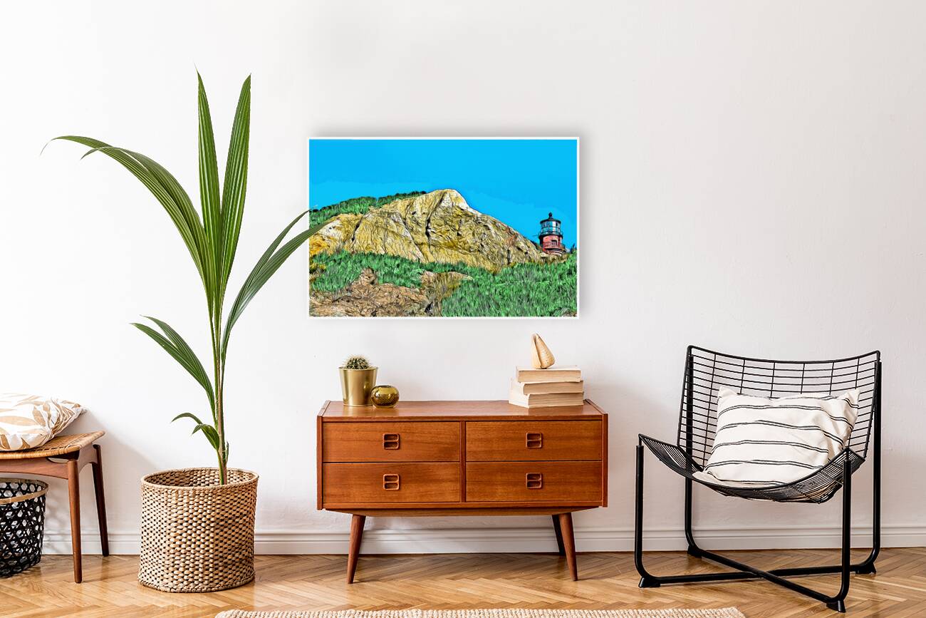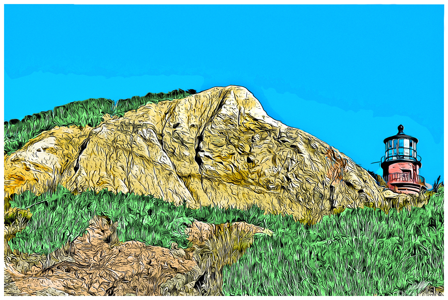 Digital illustrative painting of Gay Head Lighthouse, also referred to as Aqinnah Light, sitting over sand cliffs on the island of Martha's Vineyard, in Massachusetts.
