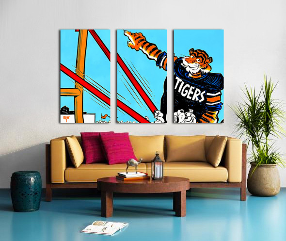 Row One Brand vintage Detroit Tigers 1960 Scorecard Wall Art Framed Print on Wall Next to a Bookshelf in Luxury Home with Happy Male Fan Standing in Foreground Wearing a Polo Shirt