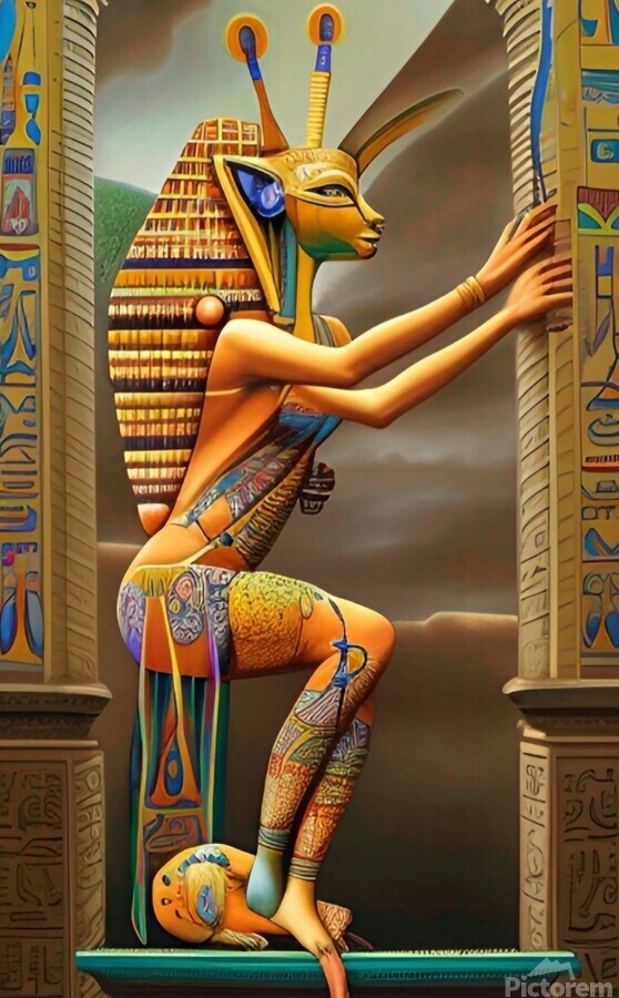 The Hyroglitches Unveiling the Truth of the Ancients In Hyroglitches the canvas serves as a portal to unraveling the mysteries of one of the worlds greatest enigmas: the hieroglyphs of ancient Egypt. This painting is a testament to the enduring legacy of a civilization shrouded in secrets and obscured by centuries of misinformation and cultural appropriation. At first glance the hieroglyphs appear as intricate patterns of symbols and glyphs reminiscent of the sacred script of the ancient scribes. Yet upon closer inspection the surface begins to ripple and warp revealing hidden layers of meaning and untold truths. It is a play on words a glitch in the matrix where the secrets of the past are laid bare for all to see. For millennia archaeologists and scholars have sought to decipher the hieroglyphs often with their interpretations clouded by bias and preconceived notions. Hyroglitches challenges this narrative shedding light on the sacred science and mystical knowledge encoded within these ancient texts. Secret spells rites of mummification and references to portals and stargates are woven into the fabric of the painting hinting at a civilization far more advanced and enlightened than previously believed. The hieroglyphs speak of a time when humanity possessed siddhi powers of consciousness elevated through the awakening of the kundalini serpent. Central to the composition is the figure of the original scribe the keeper of ancient wisdom and guardian of truth. Their presence serves as a reminder of the importance of reclaiming our heritage and honoring the contributions of the Nubian Ethiopian and black-skinned races to the legacy of Egypt. Animals and human bodies intertwine in a tapestry of unity reflecting the interconnectedness of all life and the divine nature of existence. As Hyroglitches beckons viewers into its depths it invites them to question the prevailing narratives of history and confront the whitewashing of black history perpetuated by colonial powers. It is a call to action a plea for humanity to embrace the truth of its origins and reclaim the knowledge that has been hidden from view for far too long.