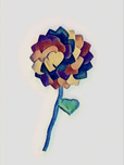 The artwork is a watercolor painting of a stylized flower with a single stem and leaf. The flower is composed of overlapping heart shaped petals in a variety of colors, including shades of purple, blue, green, and yellow. The stem is blue, and the single leaf is green. The overall style is abstract, using bold colors and simple shapes.
