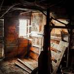 Old abandon milk house full of cobwebs glowing from the sunlight
