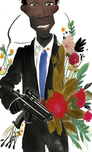 rEvolution: In the stirring portrayal of rEvolution the artist crafts a compelling narrative of the ongoing spiritual battle against the pervasive evils that afflict our world. At the heart of this transformative journey lies the imperative for inner evolution—an awakening of consciousness that serves as the catalyst for resistance and renewal in the face of oppression and corruption. Dominating the canvas is a figure shrouded in both vulnerability and strength—a black man adorned in a suit symbolizing the average citizen the father the brother the son. His presence commands attention standing resolute amidst a field of turmoil and discord. In his hands he holds an AK a potent symbol of defiance against the forces of darkness that seek to oppress and control. Surrounding the figure are vibrant bouquets of flowers their petals imbued with the radiant hues of hope and resilience. Each bloom represents a testament to the power of love and unity—a reminder that amidst the chaos and strife beauty and compassion endure as guiding beacons of light. In the background the landscape is fraught with symbols of societal decay and moral degradation—a world besieged by pollution war greed and hate. Yet amidst the darkness shafts of golden light pierce through the gloom illuminating the path towards redemption and transformation. Central to the composition is the notion of inner warfare—a reckoning with the demons that dwell within the recesses of the human psyche. Through introspection and self-reflection the figure confronts his inner shadows purging himself of the toxic influences that threaten to extinguish the flame of his humanity. The painting serves as a rallying cry for unity and solidarity—a call to arms for all who seek to break free from the chains of oppression and reclaim their sovereignty. It is a reminder that the struggle against evil begins within each individual but it is through collective action and shared purpose that true liberation is achieved. revolution is a testament to the indomitable spirit of humanity—a testament to our capacity to rise above adversity and forge a new path towards a brighter more compassionate future. In the crucible of resistance we find the seeds of hope nourished by the unwavering belief that love will ultimately triumph over darkness.We cant have a revolution if we dont first evolve.