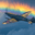 A spitfire plane soars through the sky as a vibrant rainbow stretches across the backdrop.