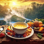 A hearty breakfast for one natural composition with a beautiful alpine landscape in the background.