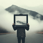 In the introspective travel concept a man stands on a road between clouds holding a frame symbolizing the limitless possibilities of the journey ahead...[+]