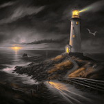 SELECTIVE COLORING USED ON THIS LIGHTHOUSE SCENE WITH SUN QUICKLY SINKING INTO THE SEA. A I PRODUCED, CYBERPUNK STYLE INFLUENCED