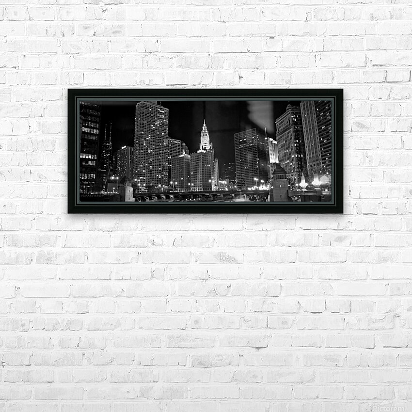 Get this artwork "wrigley building and chicago river at night pano" in a framed print.