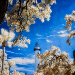 One sunny morning my wife and I embarked on a delightful journey to Saint Simons Island in Georgia accompanied by our beloved pup Cooper. Our mission? To capture the charm of the islands iconic lighthouse during the day surrounded by vibrant red foliage with majestic palm trees and live oaks framing the lighthouse. As we arrived at the lighthouse Coopers tail wagged with excitement eager to explore this new and intriguing place. The air was filled with the sweet scent of salt air and the bright foliage added a pop of color to the scene. After setting up and finding my shot I chose to capture this image with my 590nm infrared filter. As the sun rose higher in the sky casting its warm glow over the island we clicked away capturing the beauty of the lighthouse and its surroundings. The palm trees swayed gently in the breeze adding a tropical flair to the scene. And there it was—the perfect shot with the lighthouse standing tall and proud surrounded by the vibrant colors of autumn and the towering palm tree reaching for the sky. It was a moment of pure magic frozen in time for us to cherish forever. As we bid farewell to Saint Simons Island Cooper happily trotting alongside us we knew this day was filled with unforgettable memories. And as we drove home our hearts were full grateful for the opportunity to explore such a beautiful and enchanting place together.