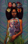 The Oracles is a captivating painting that pays tribute to the ancient wisdom and mystical abilities of black indigenous Aboriginal women known as oracles or Sybils. These extraordinary women possessed the gift of prophecy interpreting dreams fortune-telling and mastering practices such as hoodoo sacred geometry and astrology. Drawing inspiration from the First Prophetesses of Mami Wata the name Sybil holds deep significance originating from the EthiopianCushites as a sacred initiatory title for the Queen of Heaven and Mother of Gods. These priestesses and mystics served their communities by entering trance states as multidimensional mediums channeling divine prophecies that guided societal economic and political order in matriarchal societies. With an understanding of cycles science and metaphysics the oracles could predict the rise and fall of civilizations foreseeing the transition from matriarchy to patriarchy and the subsequent darkness that would engulf society. Yet they also foretold of a new era of restoration and liberation symbolized by the rise of a new sunthunder god to bring balance and harmony to the world. The Oracles serves as a visual testament to the enduring legacy of these wise women whose knowledge and teachings have transcended centuries and continents shaping civilizations and spreading peace across the globe. Through their timeless wisdom they continue to inspire and guide us on our journey of self-discovery and spiritual enlightenment.