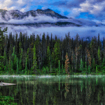 Step into the tranquil embrace of Honeymoon Lake as the dawn unveils its ethereal beauty. In this enchanting photograph, captured during the early morning hours, mist delicately blankets the serene waters, shrouding the landscape in a veil of mystery. As the sun timidly peeks through the swirling clouds, its gentle rays cast a soft glow upon the tranquil scene, illuminating patches of blue sky amidst the ethereal mist. Wisps of cloud weave through the lush tree line, adding a touch of whimsy to the serene ambiance. Immerse yourself in the peaceful serenity of Honeymoon Lake, where the delicate dance of light and mist creates a symphony of dawn's enchantment.