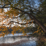 This beautiful autumn photograph was taken one October day while I was walking around the banks of one small lake in Serbia. That lake is not so big but it is very nice surrounded by trees and vegetation from all sides. In some parts the branches literally lean over the water making the lake more beautiful. This is one such scene where one big tree can be seen completely towering over the water of the lake with its branches. There are golden yellow and red leaves on the branches but a little greenery can be seen as well in the background. Withered copper-colored leaves fell into the water making it shimmer in the sunset. Autumn is without doubt one of the most beautiful seasons especially on the lakes or rivers with trees close to it at sunset. One October late afternoon in Sumadija Central Serbia. From the Lakes collection.
