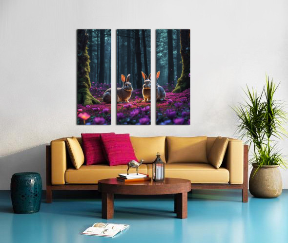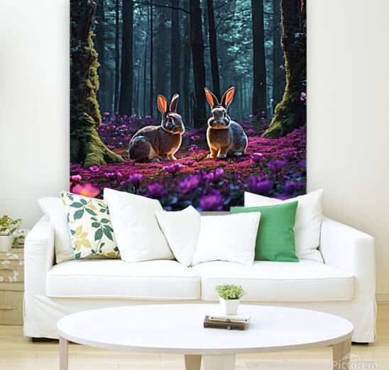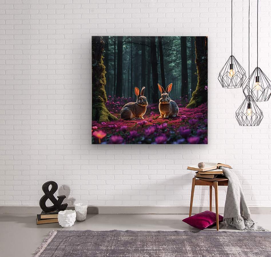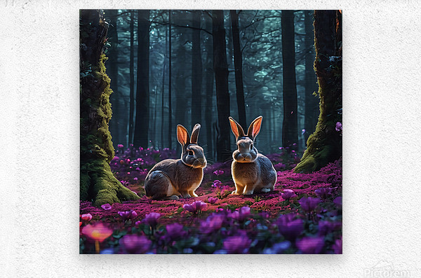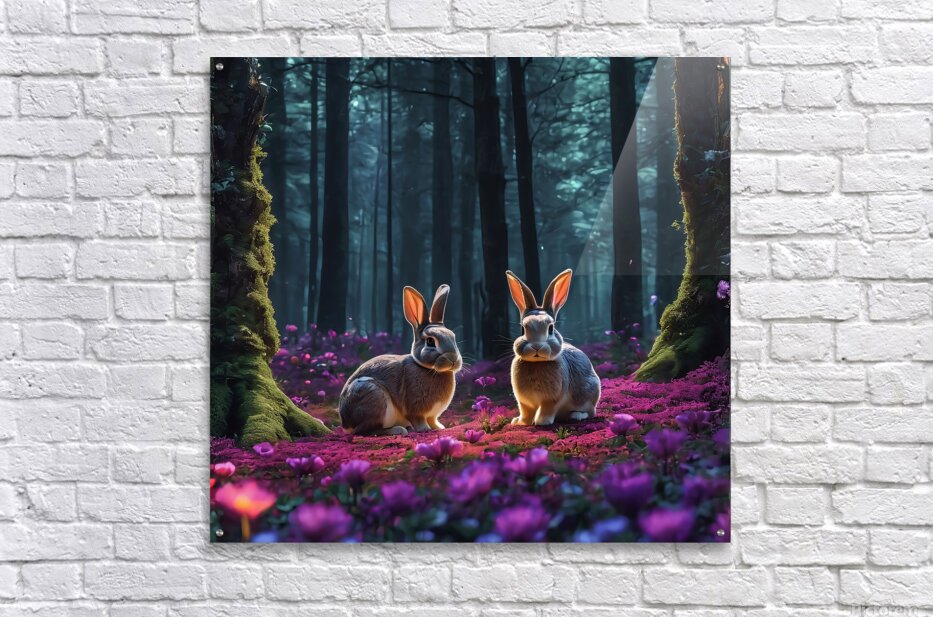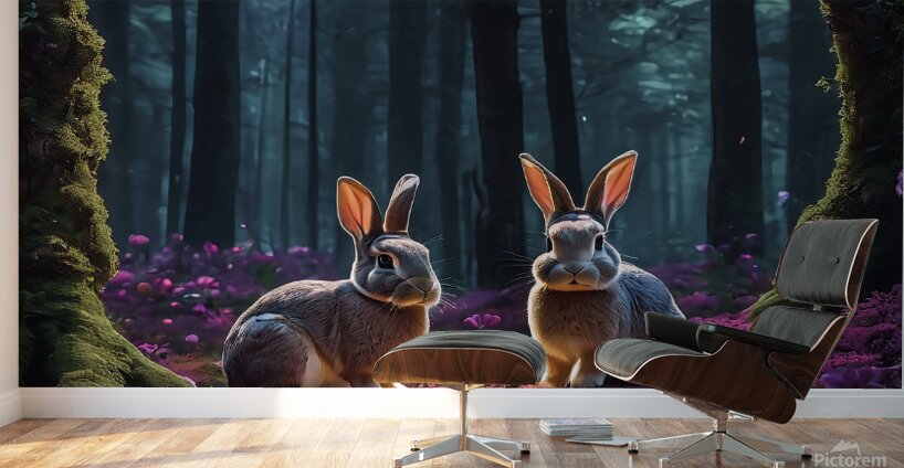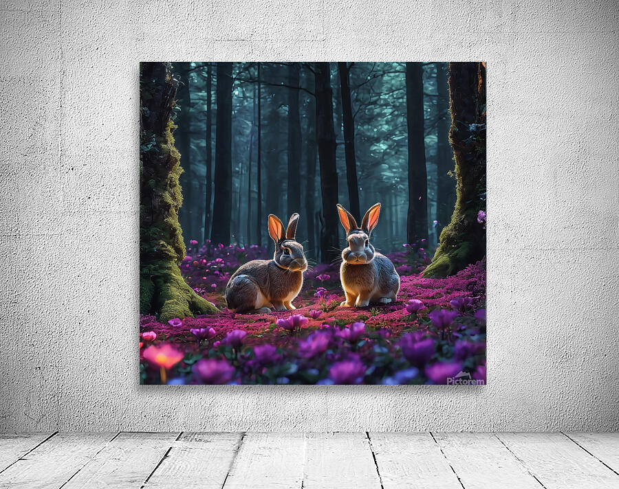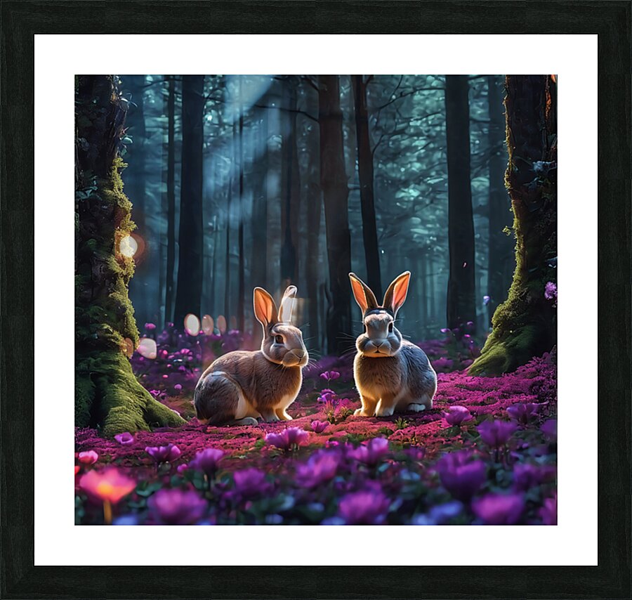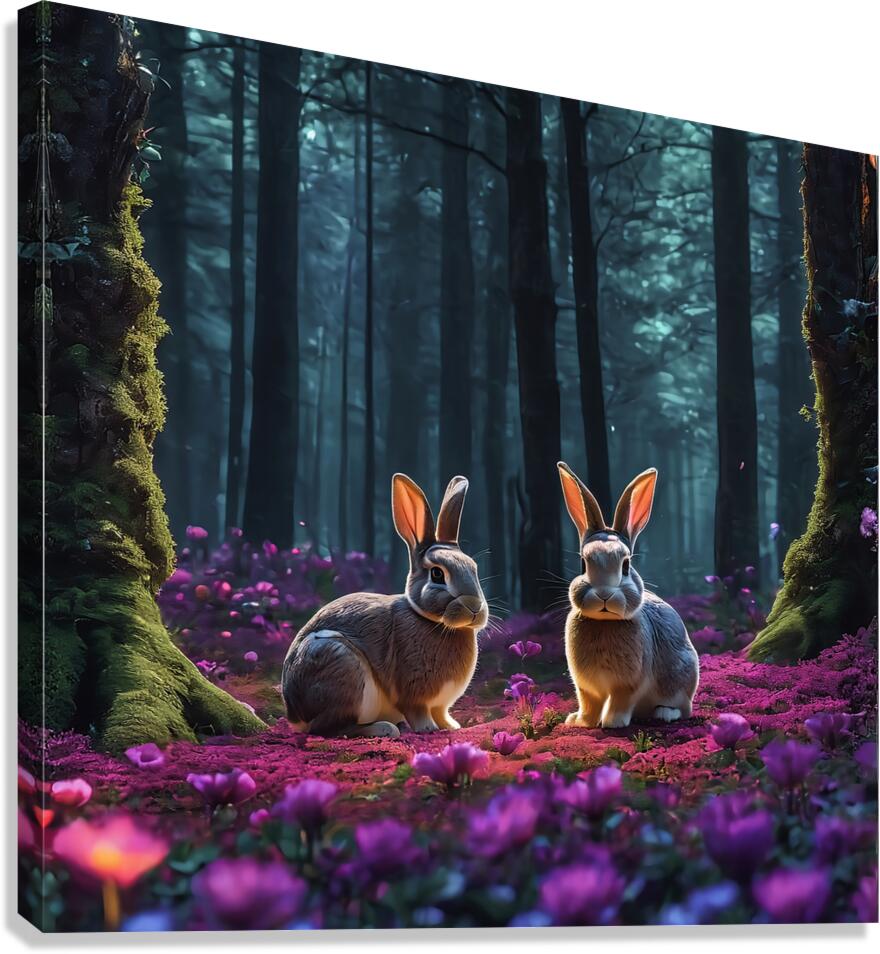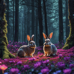 Two adorable bunny rabbits in an enchanted forrest with neon flowers.