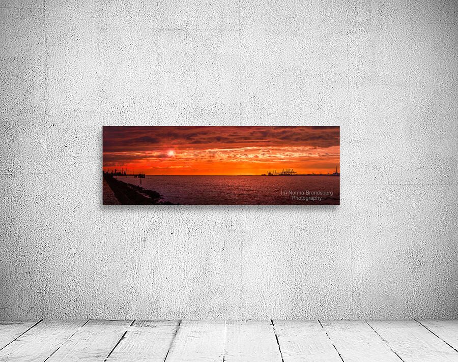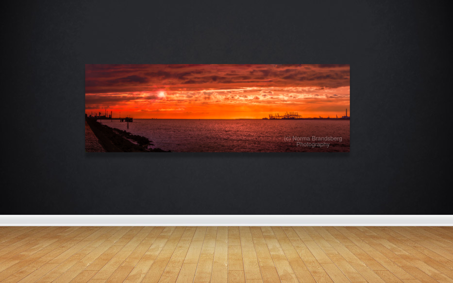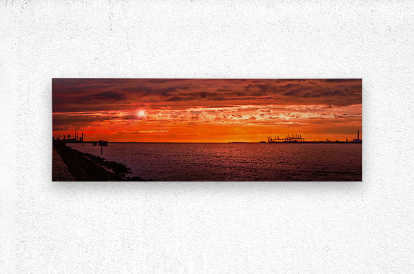 Staying in Honfleur, Normandy, France gave us the opportunity to view Le Havre across the Seine River from under the Pont de Normandie connection bridge as the river merges with the English Channel. The bridge is the major pathway route joining the two regions. I took the opportunity of photographing the silhouette of the shipping cranes at sunset, a ship in the port and have edited it as a panorama.