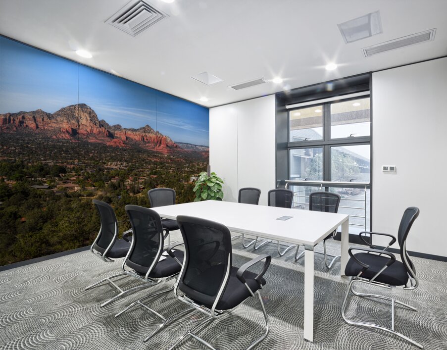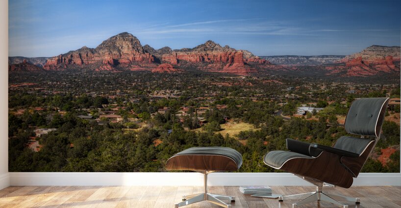 Immerse yourself in the tranquil beauty of Sedona, where the vibrant cityscape emerges amidst the awe-inspiring grandeur of majestic mountains. In this captivating image, the desert sky stretches out in a tranquil expanse of blue, adorned with light bands of clouds that lend a subtle haze to the atmosphere. Nestled amidst the rugged terrain, the city of Sedona reveals itself in scattered bursts, peeking out from behind lush trees that scatter the landscape. Beyond, the imposing silhouette of towering mountains rises majestically, their red rock formations standing as silent sentinels against the horizon. As you gaze upon this scene, you can't help but be captivated by the juxtaposition of urban charm and natural splendor that defines Sedona's unique allure. Experience the serenity of this desert oasis, where every view is a testament to the timeless beauty of the Southwest.