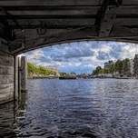 For a few hours renting a boat, I got to see what the boat captains viewed when traveling the canals of Amsterdam in the Netherlands. Captured under the Skinny Bridge or the Magere Brug as it is also called, the framed view saw the central city, the Intercontinental Hotel on the left. This view allows the viewer to see the details of construction under the bridge. A wooden draw bridge above is part of the bridge construction. The famous skinny bridge across the river Amstel and opposite of the Carré theatre, is an Old Dutch design wooden bridge known as a double-swipe (balanced) bridge. Tradition relates that the bridge was named after the sisters Mager, who were supposed to live on opposite sides of the river. They are said to have had the wooden bridge built to make it easier to visit one another. However it appears more likely, that the original bridge acquired the name from being so narrow (mager means skinny in Dutch), that it was hard for two pedestrians to pass one along another. As traffic along the river Amstel increased, a wider bridge replaced the narrow one in 1871. Skinny Bridge is far not skinny anymore, but one of the most beautiful bridges of Amsterdam. At night many lights illuminate the bridge, then it becomes a very romantic place, popular with lovers and photographers. Several other bridges of this type are found in Amsterdam (at the Staalstraat/Grimburgwal, Nieuve Herengracht, Rapenburg, Prinseneiland and Bickerseiland). The bridge is situated on Amstel, between Keizersgracht and Prinsengracht.