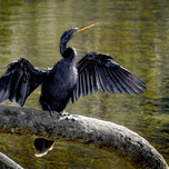 A long-necked, long-tailed swimmer, Anhinga birds of southeastern swamps in Florida. Often seen perched on a snag above the water, with its wings half...[+]