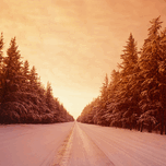 WINTER ROAD THROUGH PINE FOREST