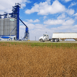 a truck passes mature harvest ready canola in from of an inland grain terminal near St. Agathe Manitoba Canada