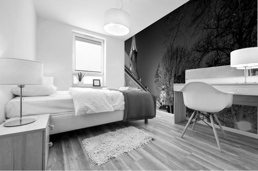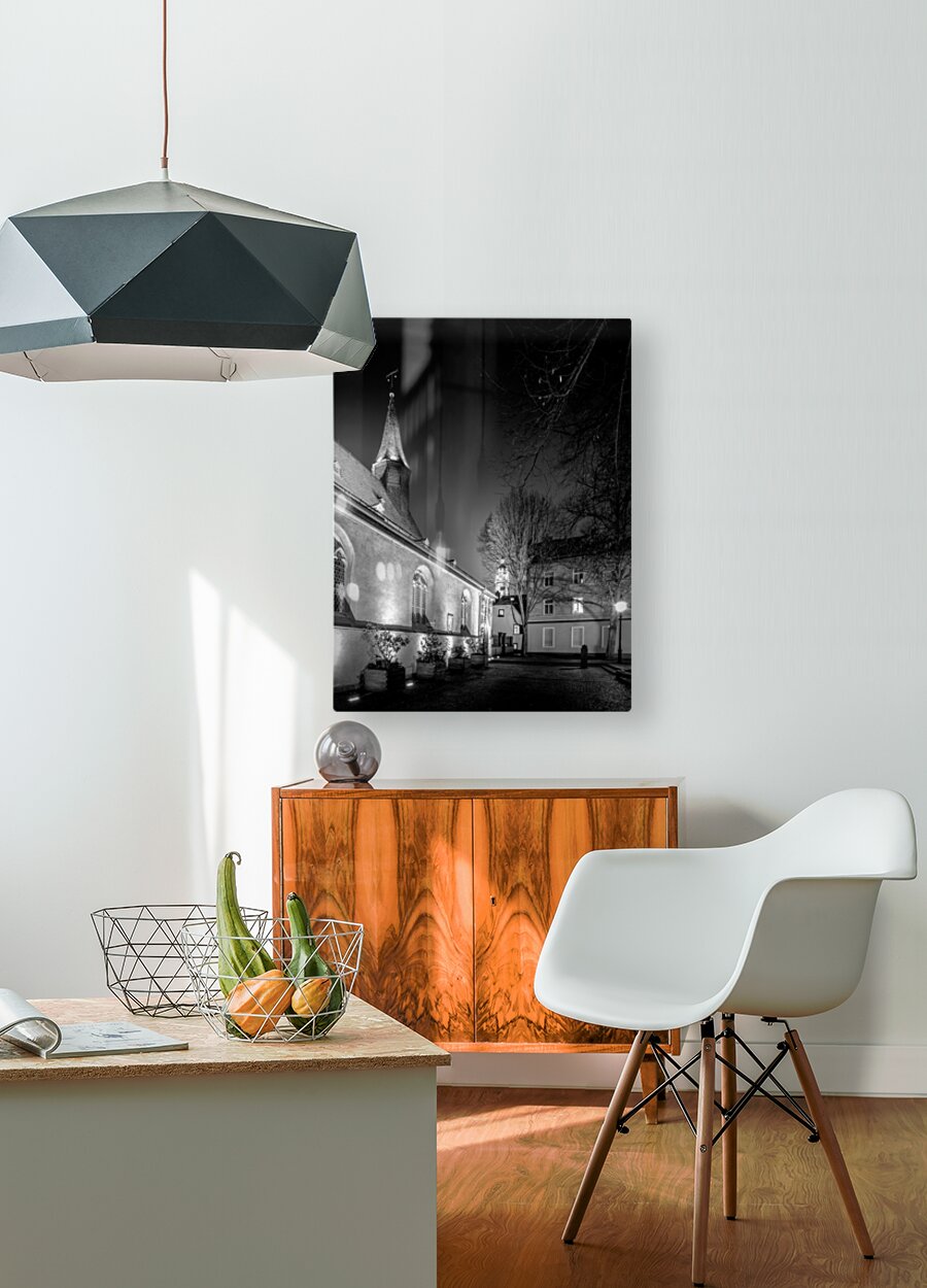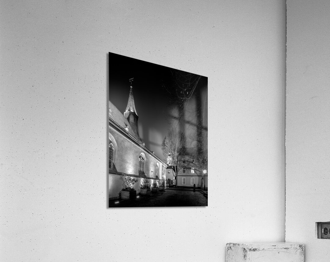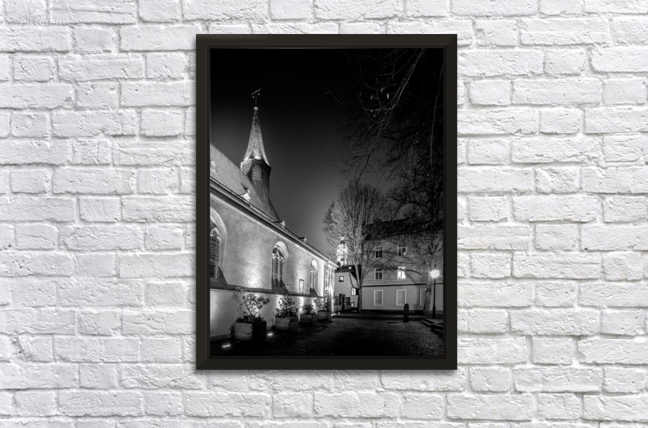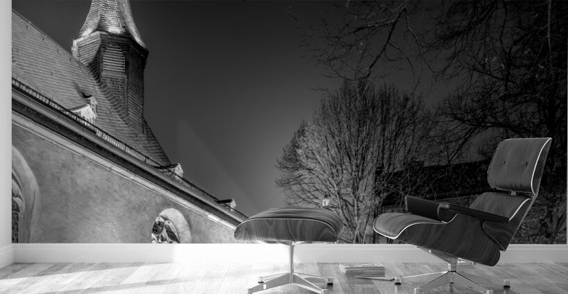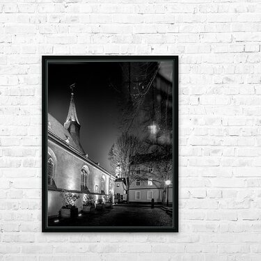 Visit two of Frankfurt Germany's most iconic landmarks in one day! Hochster Schloss or castle, pictured off in the distance is a moated castle that was once the residence of the Counts of Hanau-Lichtenberg and is now a museum. Saint Justinus Church is a Carolingian church in the Höchst district of Frankfurt, Germany. It is the oldest building in Frankfurt and one of the oldest churches in Germany. The church was built in the 9th century and is dedicated to Saint Justin the Confessor. Both buildings are located in the Höchst district and are a short walk from each other. Edited in black and white in a vertical image.