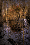 Think winter is dull! I love this photo of the coastal marsh of South Carolina, alive near sunset, the golden lowland vines covered with bright shinny red berries, decorated like a winter Christmas tree with mirrored reflections in the pale lowland wetland swamp water. located between near Awendaw, McClellanville, Charleston and Mount Pleasant SC.