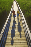 children walk along the Grassy Narrows Boardwalk with insect nets and pails