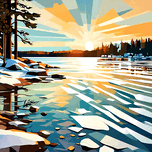 Tranquil thawing water drenched in rays of evening sunlight. Barron's Lake, Muskoka, Ontario.