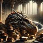 This enchanting image presents a dragon of magnificent scale, nestled among endless piles of ancient tomes in a cathedral-like library. The soft illum...[+]