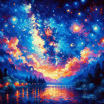 This artwork is a colorful and vivid reimagination of Van Gogh’s famous Starry Night Over the Rhone. It depicts a night sky filled with swirling stars and celestial bodies that illuminate the scene below. The water reflects the radiant energy of the sky above it. The brushwork is dynamic and impasto-like adding texture and movement to the composition.