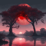 The red moon at twilight under large trees on a river of water A wall painting of a large moon at red twilight reflected in the river water and large trees