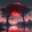 The red moon at twilight under large trees on a river of water A wall painting of a large moon at red twilight reflected in the river water and large ...[+]