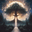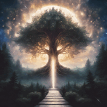 A throne of trees, a bright glowing crown of light under a bright star filled sky with White Script text at the bottom that says: " Tree of Light", fa...[+]