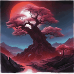 the ethereal beauty of a mystical landscape under the red moonlight. The scene should be illuminated by a large, radiant moon, casting its glow upon a twisted, yet majestic tree with blossoms that seem to sparkle in the night. The tree's roots should be deeply embedded into rocky terrain, symbolizing its ancient existence. In the background, towering mountains loom, their peaks veiled in mist. A serene lake at the foot of the mountains reflects the moon's luminescence. Incorporate elements that evoke a sense of magic and mystery.