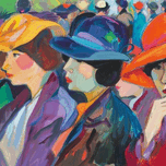 Each subject's hat is a blossoming flower of color, from radiant oranges to deep purples, while the faces are painted with a less saturated, yet still expressive palette. The brushwork is loose and flowing, giving life and movement to the clothing and background, which are abstracted into a dance of colors rather than distinct forms. This image exemplifies the Fauvist style, characterized by its use of intense, unmodulated color to convey emotional states. Fauvist artists broke away from realistic values and instead used color to create a direct, instinctual response. The brushwork is typically bold and spontaneous, creating a sense of dynamic movement.