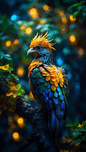 a colorful phoenix bird, overlooking the night sky. the bird is resting on a tree branch covered by green leaves in a lush forest with a dark magical ambience, bokeh, blue yellow lighting