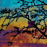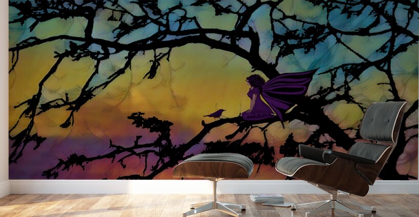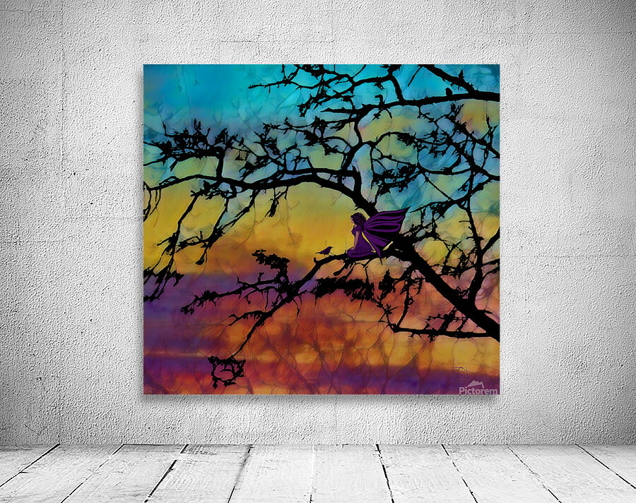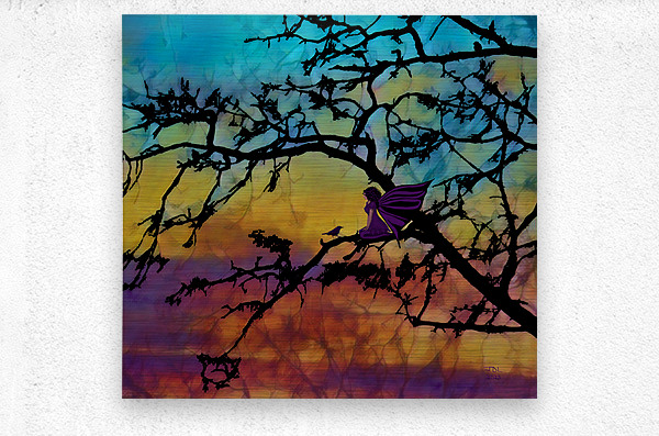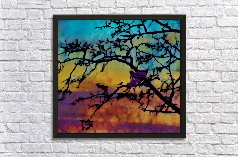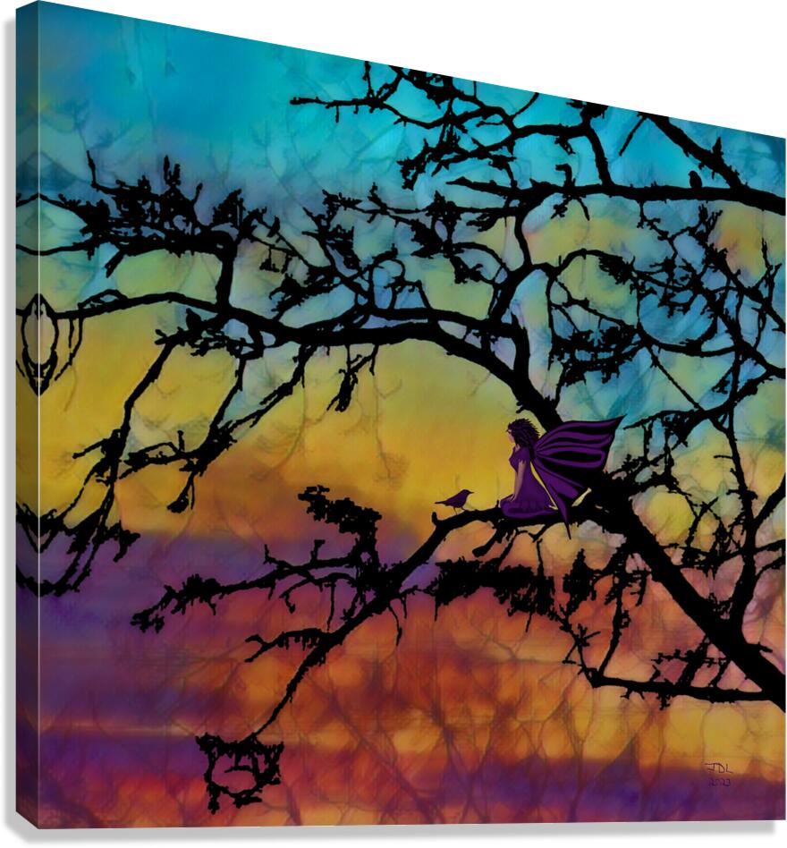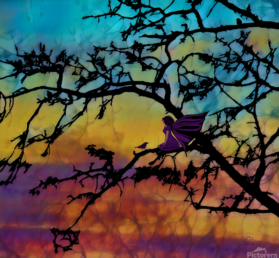 On a branch of a tree, amidst the colors of a brilliant Autumn dusk, a Faerie and a bird enjoy the pleasant conversation of good friends.