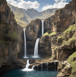A majestic waterfall cascading down rugged cliffs into a sparkling pool below