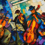 A quartet of musicians is animated in a fervent performance, their instruments a vivid extension of their expressive poise. Dominated by blues and ora...[+]